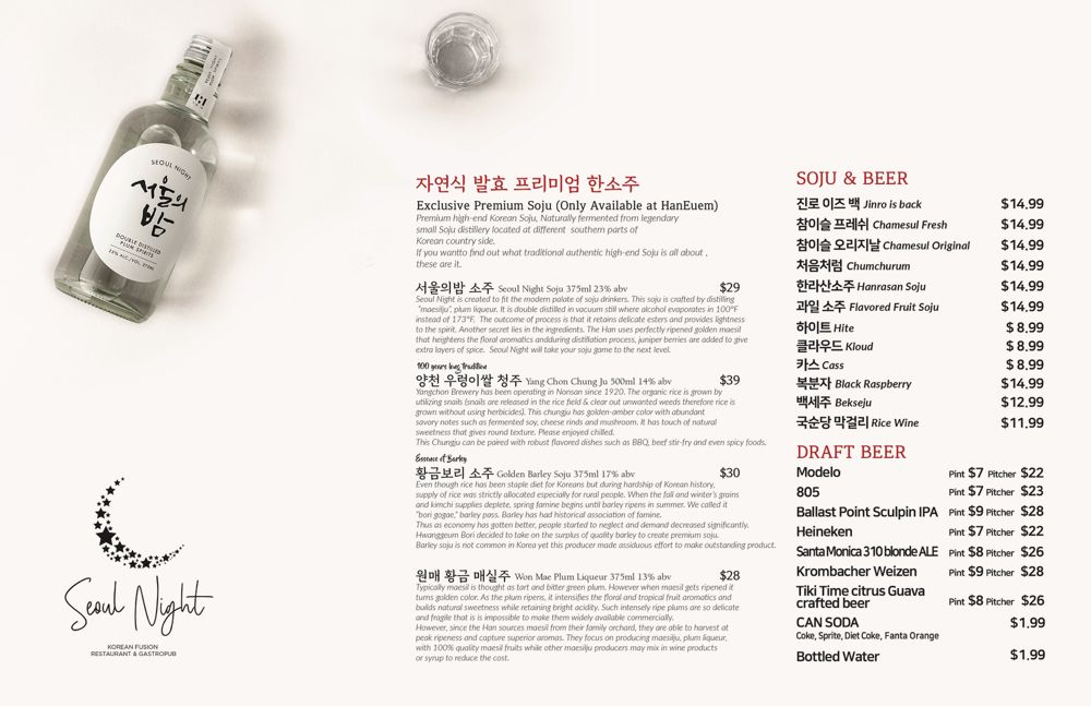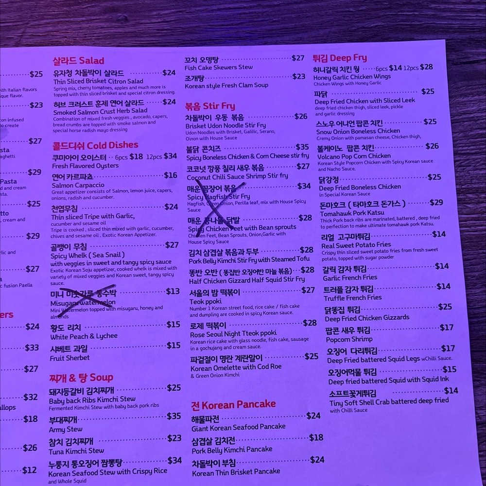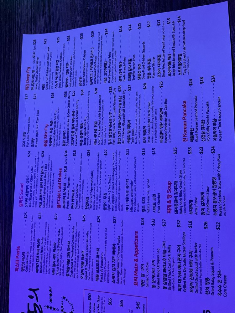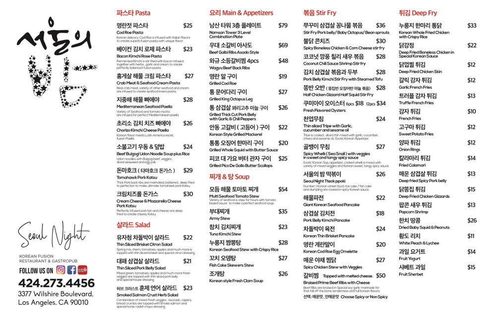 Seoul Night by is a Korean gastropub located in Los Angeles, offering a range of upscale dishes with a unique twist. The menu features standout items like the Crab & seafood creamy pasta, Multi seafood tomato stew with crispy rice, Seafood Korean pancake, and crunchy snacks with salsa. Customers rave about the generous portions and flavorful dishes, such as the Bacon Kimchi Pasta, Grilled Octopus Leg, and Green Onion Fried Chicken, all rated 5/5. The restaurant also boasts a selection of premium imported sojus and a cozy rooftop setting perfect for gatherings with friends. With excellent service and a varied menu, Seoul Night by promises a memorable dining experience in K-town for both locals and visitors.